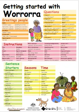 A great poster to help you start talking Worrorra. You can practice saying hello and goodbye, ask questions, give instructions such as ‘Come here’ or ‘Go away’ and there are some sentence starters to help you with Worrorra conversations. The poster is available in a range of sizes, why not get one for every room in your house, school or community centre and start speaking Worrorra today.