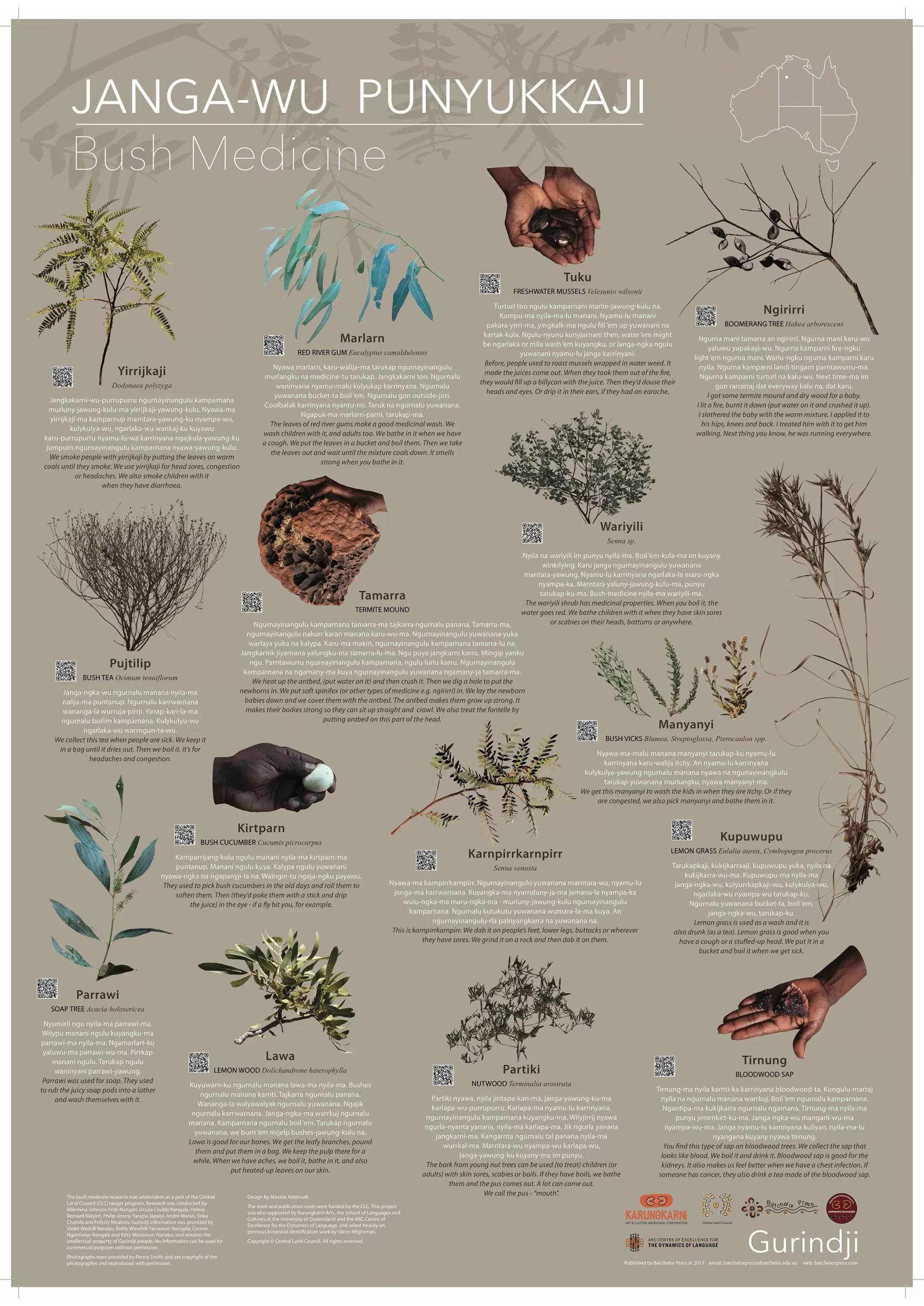 The Gurindji bush medicine poster provides cultural information in Gurindji and English about local plants used for treating different illnesses. It was produced at Kalkaringi by the Murnkurrumurnkurru Ranger group with Felicity Meakins and Karungkarni Arts as a part of the Central Land Council (CLC) ranger program.
