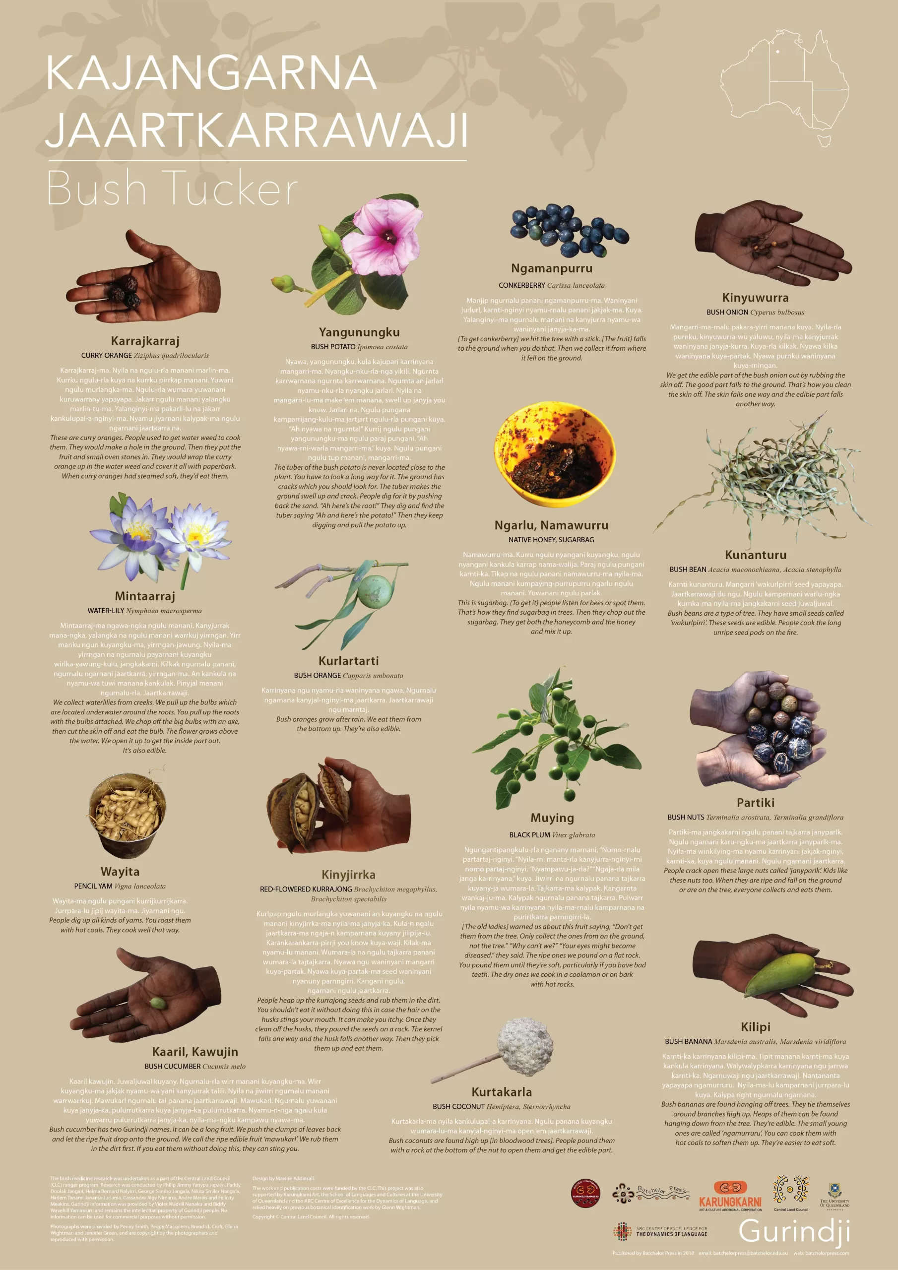 The Gurindji bush tucker poster provides cultural information in Gurindji and English about local edible plants. It was produced at Kalkaringi by the Murnkurrumurnkurru Ranger group with Felicity Meakins and Karungkarni Art as a part of the Central Land Council (CLC) ranger program.
