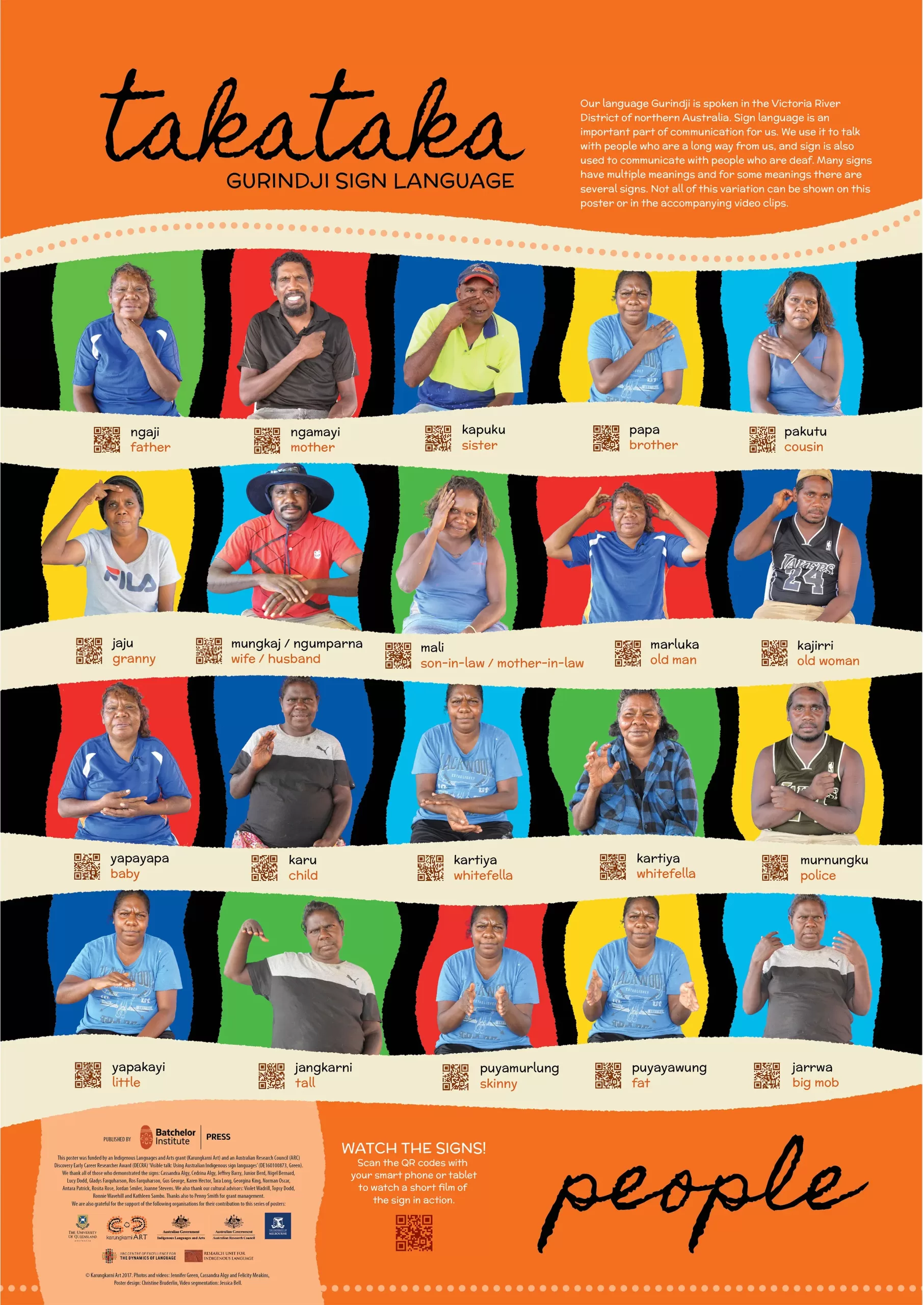 Our language Gurindji is spoken in the Victoria River District of northern Australia. Sign language called ‘takataka’ is an important part of communication for us. We use it to talk to people a long way away, and sign is also used to communicate with people who are deaf. Here are some of our signs! You can also watch us demonstrating the signs through the QR codes with your mobile phone. The posters were produced by Jennifer Green, Cassandra Algy and Felicity Meakins through Karungkarni Art. See links to the other 3 posters or the full set in this series: http://batchelorpress.com/node/370 http://batchelorpress.com/node/371 http://batchelorpress.com/node/372 http://batchelorpress.com/node/373